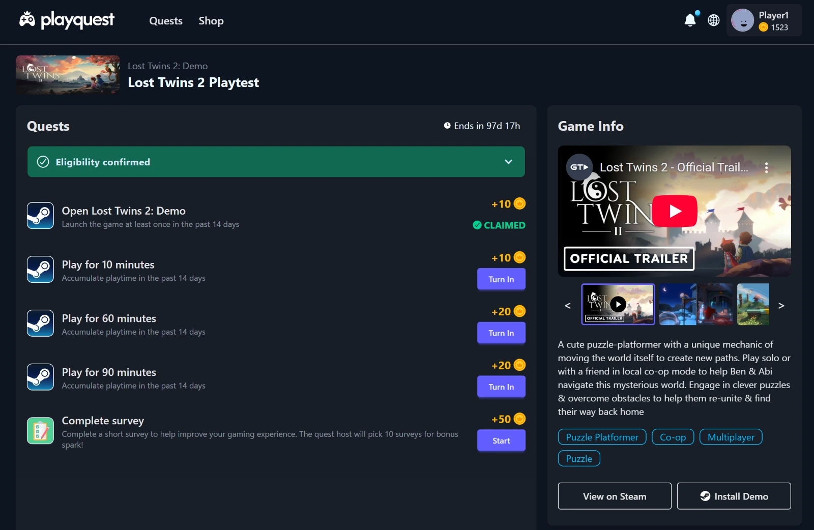 Game developers set up quests for their Steam games (like "play for 30 minutes" or "complete the tutorial"), and we track completion automatically. Only players who finish the quest get the reward provided